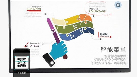 智能菜單,全通道批注、智能側邊菜單欄,簡單手勢快速調出,操控便捷、標配Android書寫軟件,隨心標注郵件、掃碼方式保存,隨帶隨走