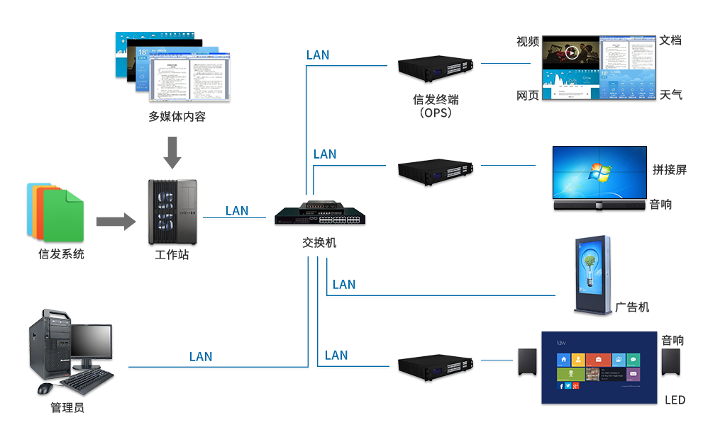 企業辦公信息發布系統總共分為5個部分,分別為:信息管理端、工作站、局域網、信息發布端及顯示終端。這一個完整的系統可將視頻、圖片及文字統一調配分別投放在各顯示終端。此外,顯示終端還能開發更多功能,例如用戶可在顯示終端實現反向控制對系統信息作出反饋等。