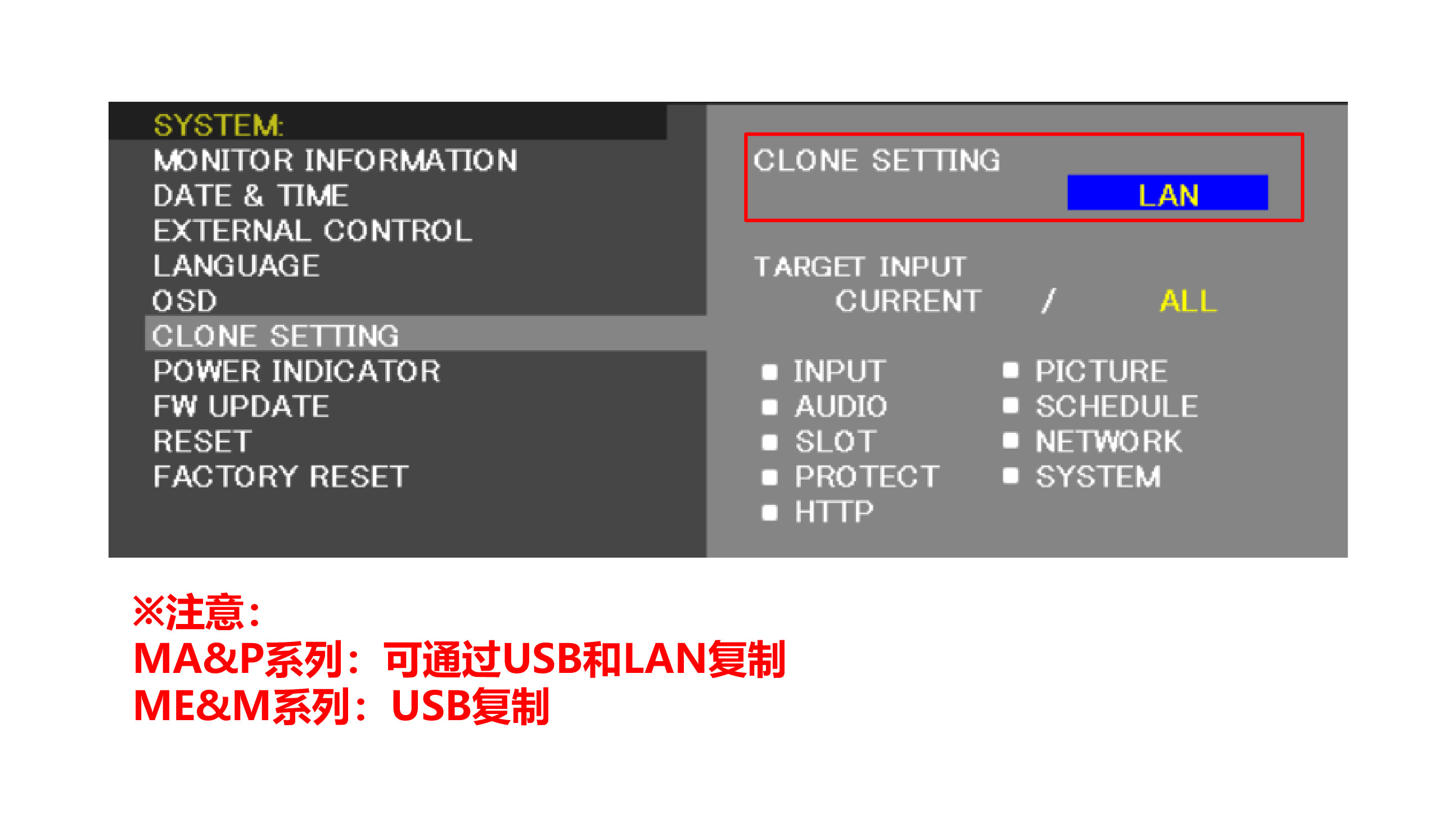 通過U盤或LAN,可將目標顯示器的參數(shù)復制到指定顯示器