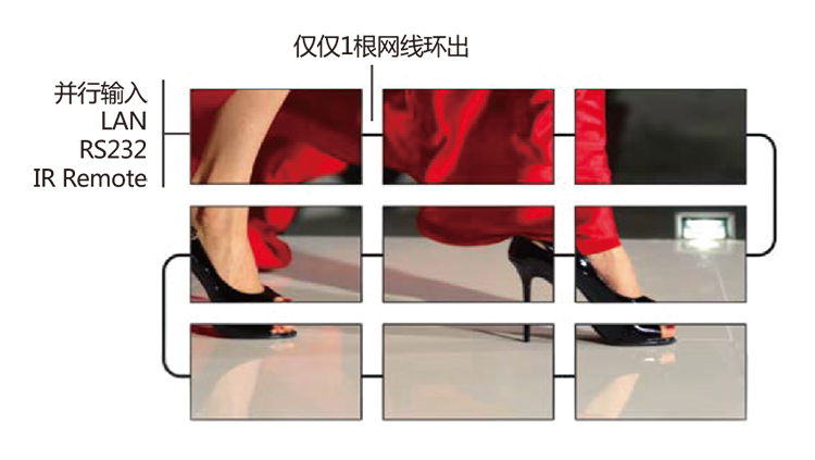 控制信號(RS232\LAN\IR Remote)通過一根網(wǎng)線(RJ45)環(huán)出;最大 可支持100臺顯示器的菊花鏈,有助于減少連接線纜和人力成本。